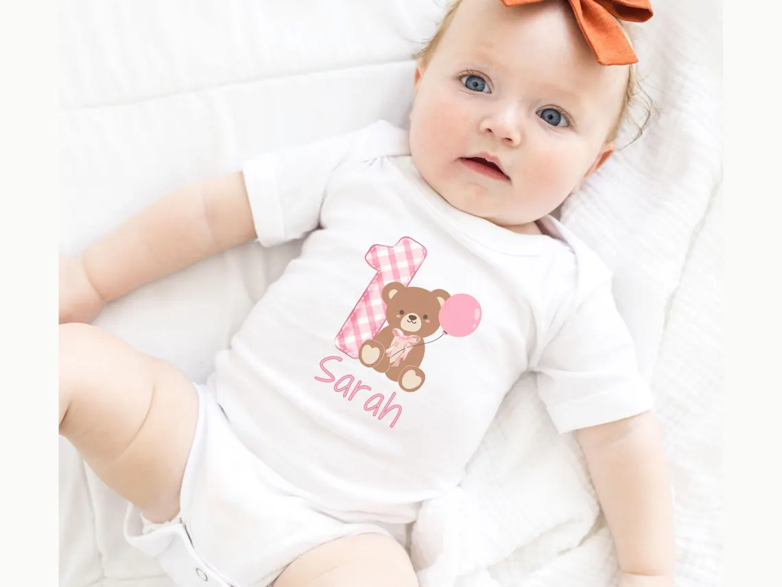 Each shirt features a sweet teddy bear holding a pink balloon, symbolizing your little one’s first big milestone. Whether it’s for Mommy, Daddy, Sister, Brother, or your birthday girl/boy, each tee or romper can be customized with your child’s name and age, making it a precious keepsake for years to come.