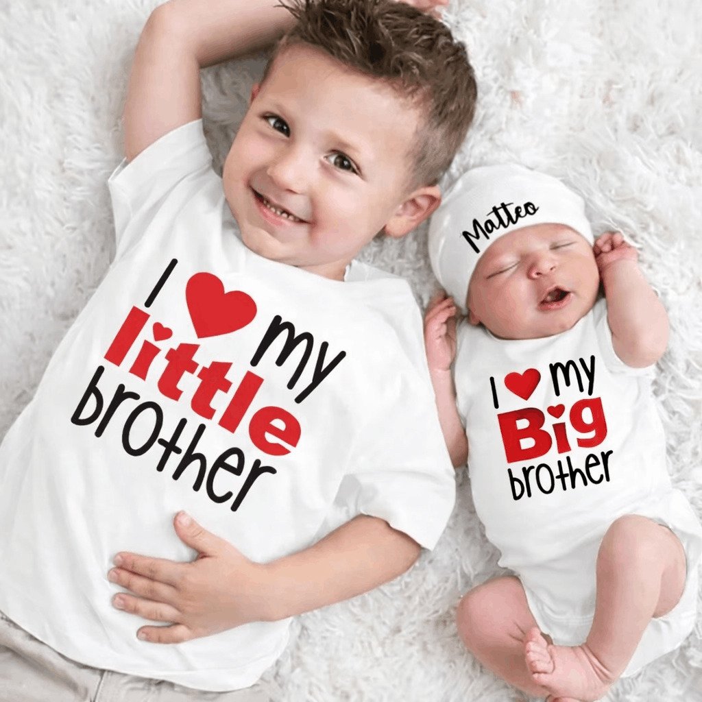 Celebrate the beautiful bond between siblings with our I Love My Little Brother & Big Brother Matching T-Shirt & Romper Set. This adorable combo is perfect for welcoming a new baby while making the elder sibling feel extra special. Made from soft, breathable cotton with a bold love-themed print, this set is ideal for photoshoots, gifting, and everyday wear.