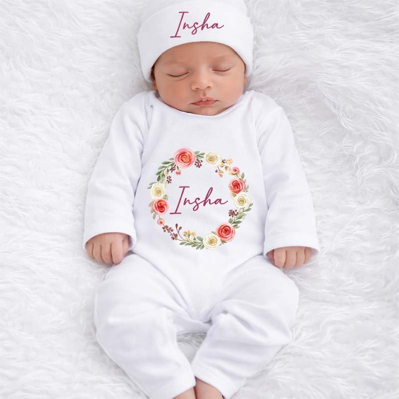 Personalized Name Floral Romper with Cap – A Delicate & Timeless Outfit for Your Little Blossom