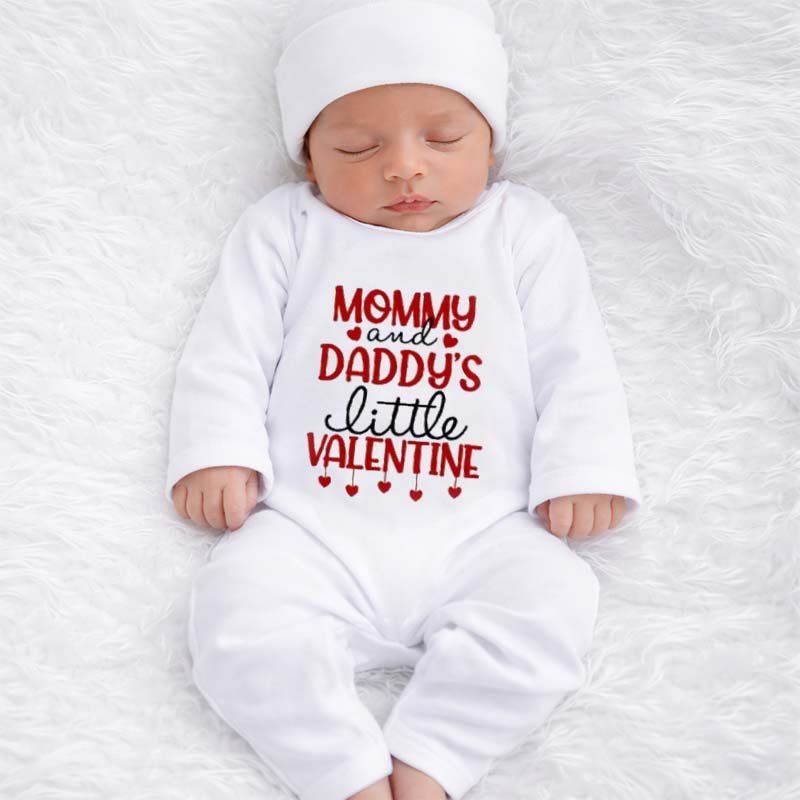 Introducing the “Mommy and Daddy’s Little Valentine” romper, the perfect addition to your little one’s  wardrobe. This onesie isn’t just a garment; it’s a proclamation for your newest family member’s grand entrance